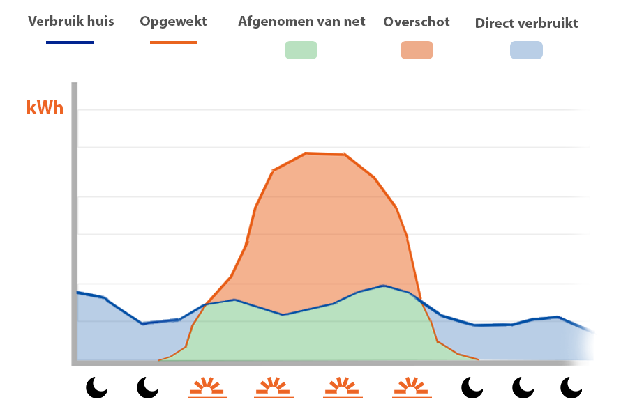 Terwijl de zonnepanelen werken (overdag), verbruik je 3000 kWh aan opgewekte elektriciteit direct met je huis.